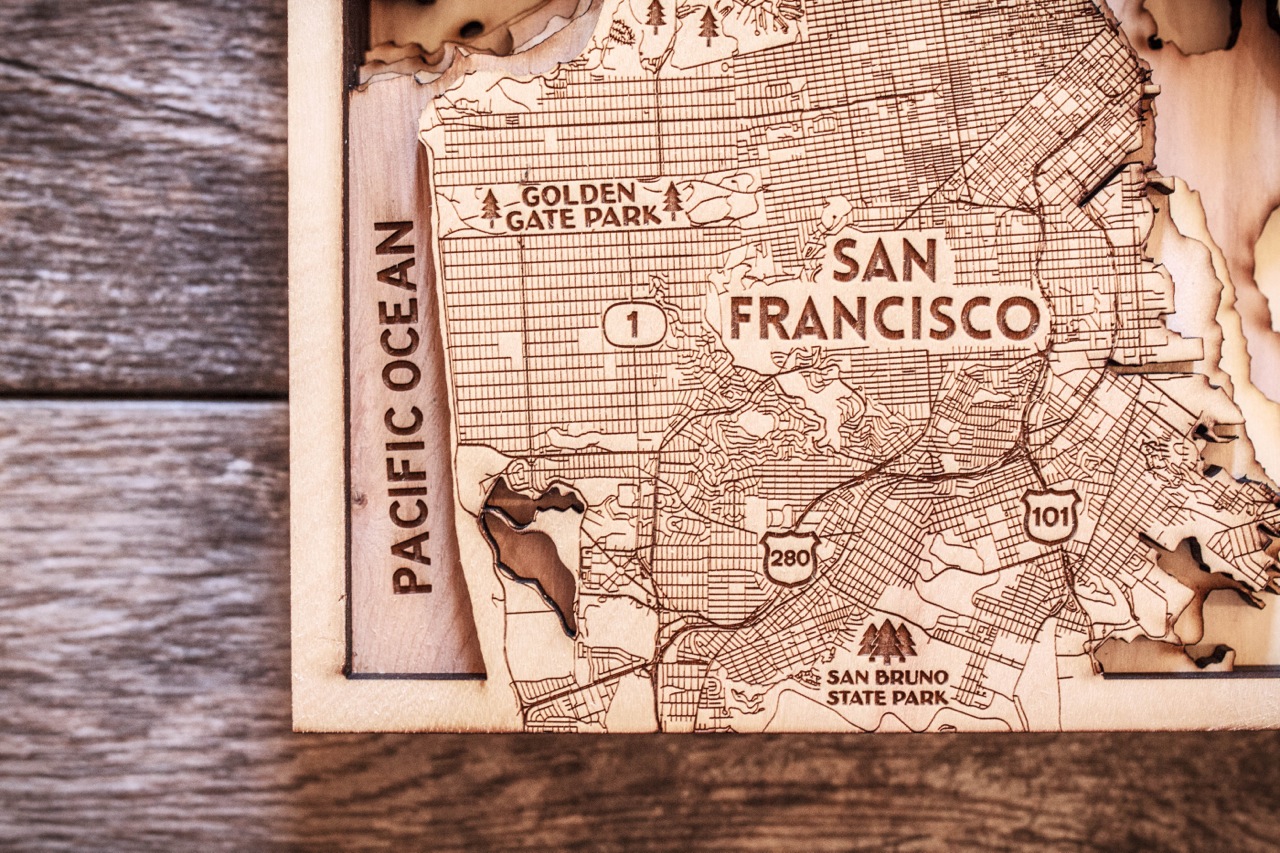 Don't worry about leaving your heart in San Francisco when you can grab this wood map as a memento! Accurate street grids are engraved with thousands of tiny details along with underwater contouring of the bay to give a unique 3D perspective. Perfect for any home or office!