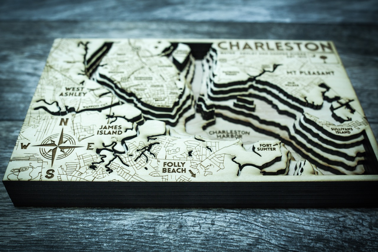 The Chucktown Wood Map! Grab one of these unique 3D Maps of Charleston and take it with you wherever you go! This map includes an accurate city grid and underwater contouring.