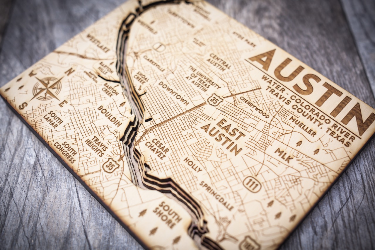 The Austin 3D Wood Map makes the perfect gift or collectable piece. Thousands of accurate street level details are engraved and river contours are intricately mapped in wood for an awesome perspective on the city. Medium and Large sizes come with hanging hardware installed. Small sizes typically sit well on shelfs or mantels. Keep Austin Weird!