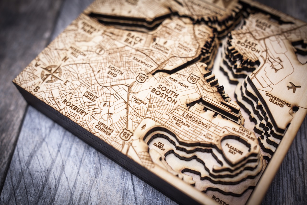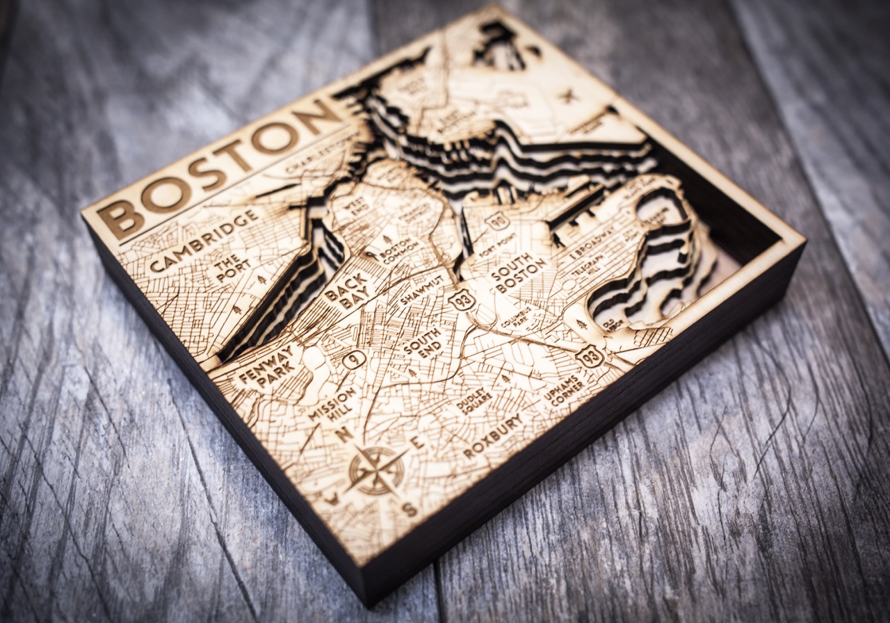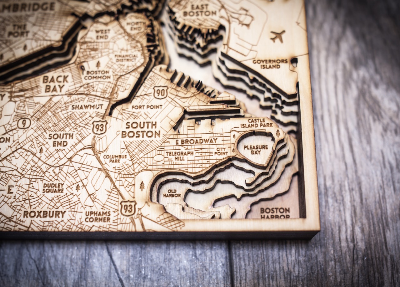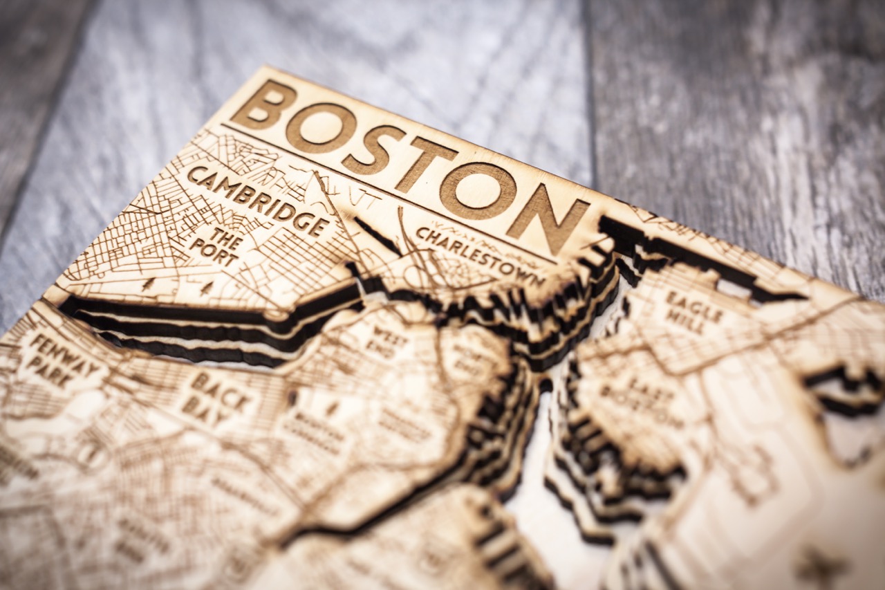 The Boston 3D Wood Map highlights favorite spots around the city as well as Boston Harbor. This map will make the perfect gift or collectable piece for any Beantown Lover! Accurate sea contours are intricately mapped in wood for an awesome conversation piece. Medium and Large sizes come with hanging hardware installed. Small sizes typically sit well on shelves or mantels.