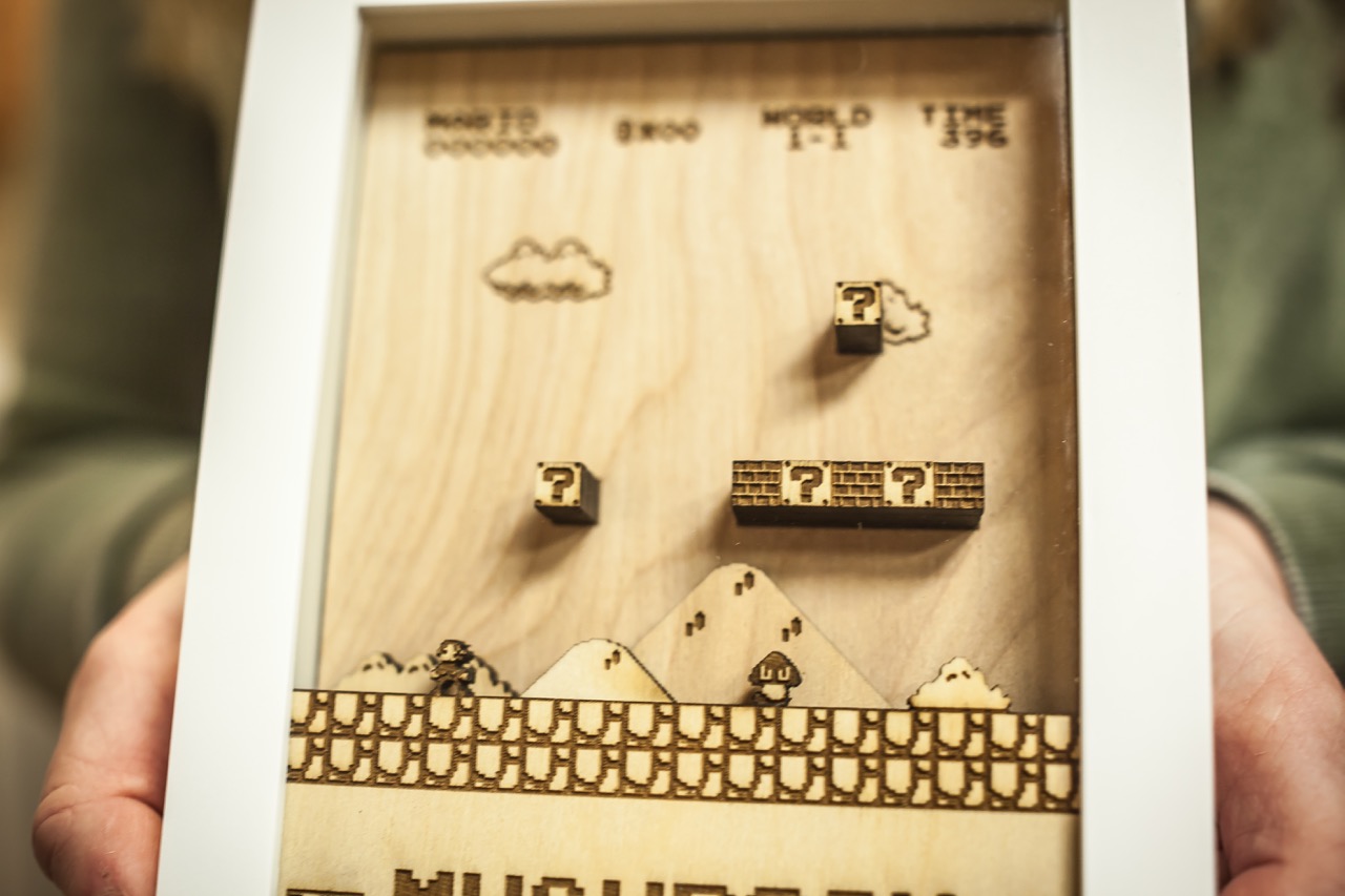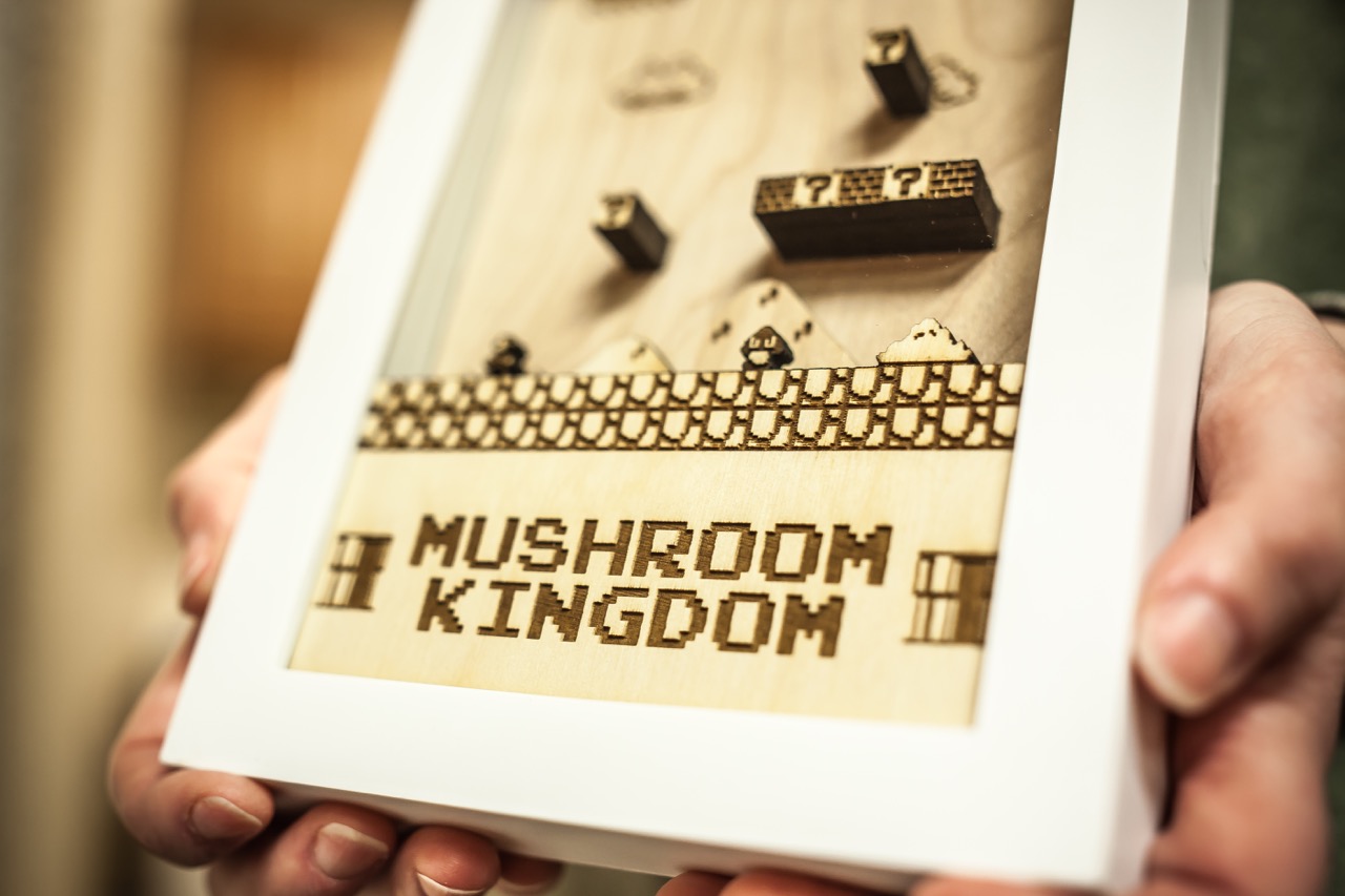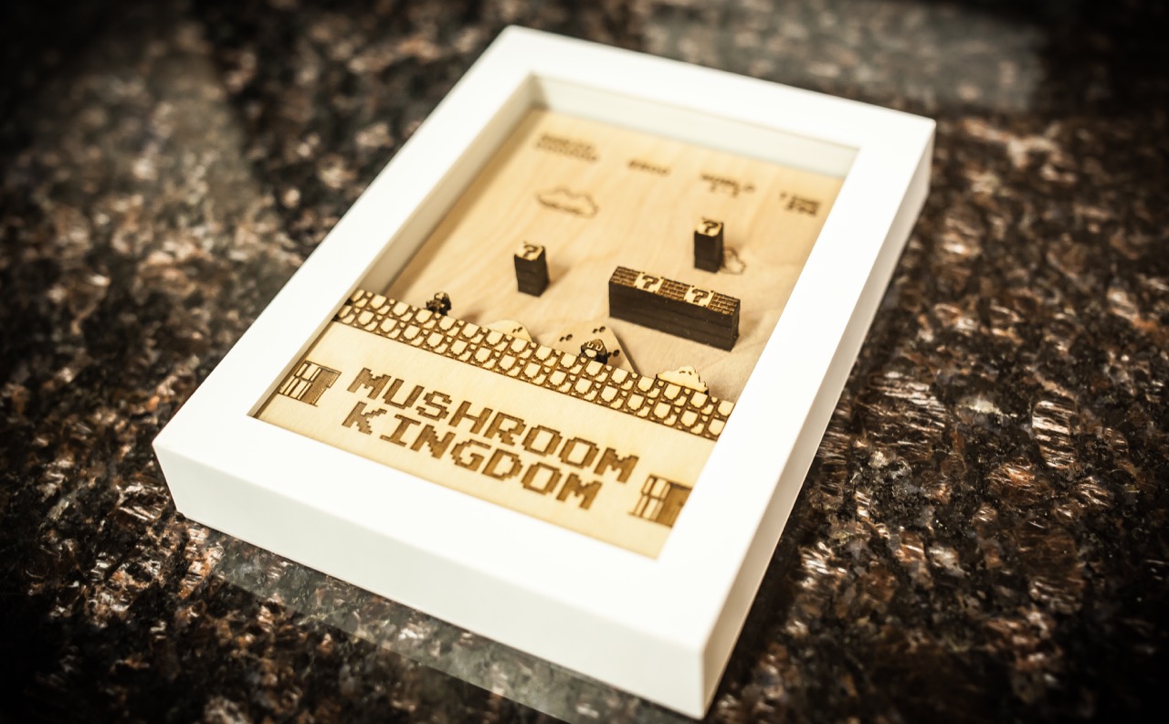 Where it all started... World 1-1. This 5x7 sleek, white frame showcases a layered Mario level. 3D boxes hover over Mario as he awaits to jump on the mushroom. This piece is a great addition to any gallery, work space, kid's room, or home. A fun and unique gift for a Nintendo enthusiast!